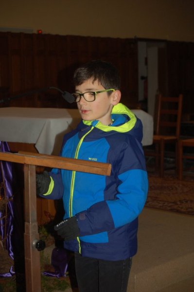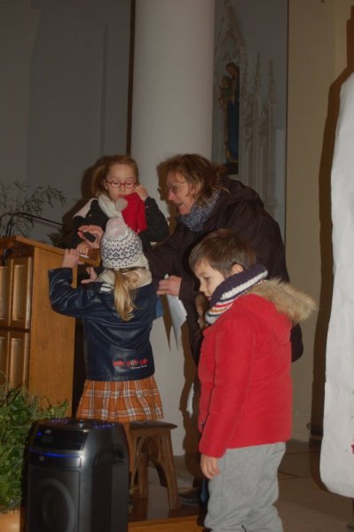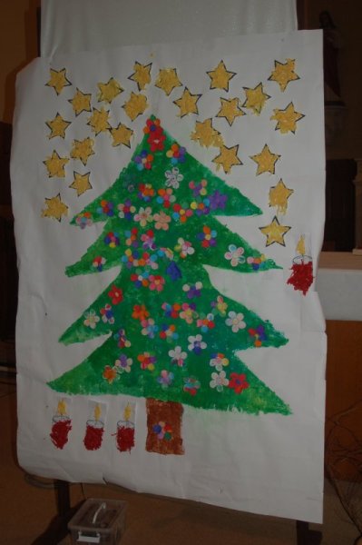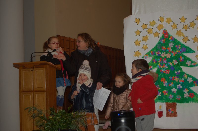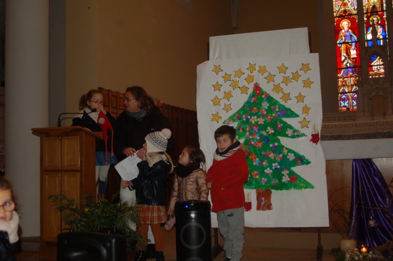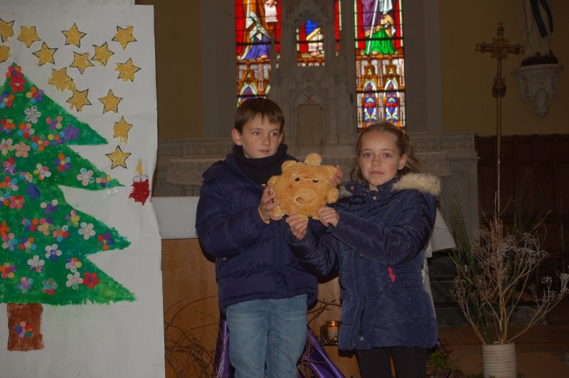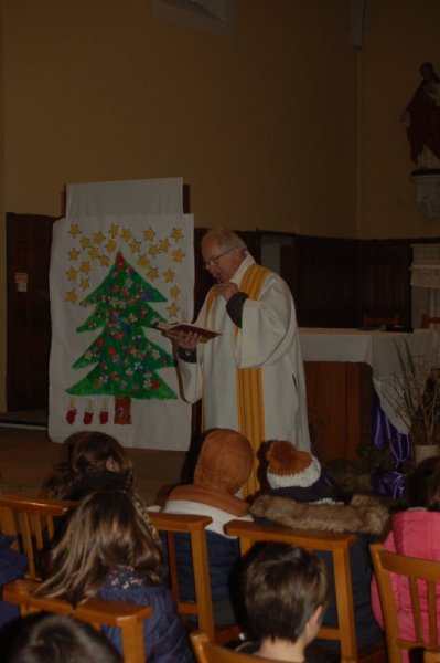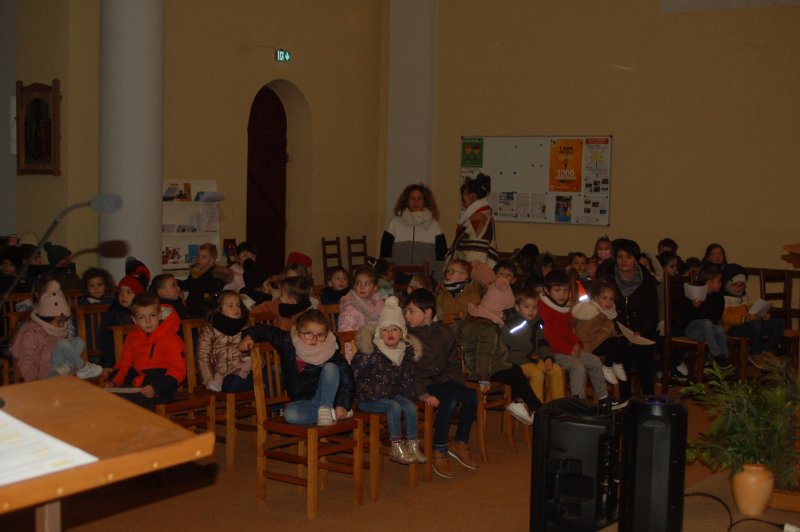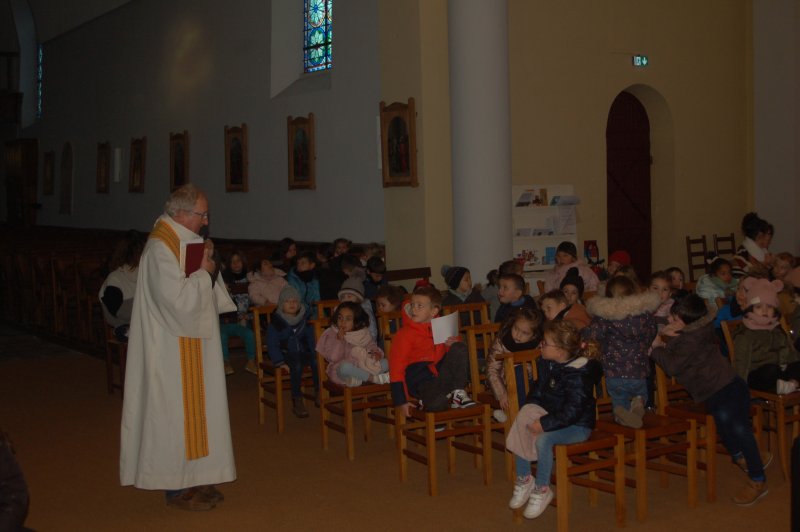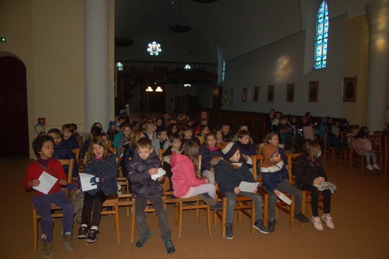 Vendredi 16 décembre, toute l’école s’est déplacée à l’église pour poursuivre le temps de l’Avent et se préparer à la fête de Noël. Accueillis par le prêtre, nous avons chanté avec Mireille et écouté deux contes évoquant l’entraide et l’espérance dans des moments difficiles de la vie. Les maternelles ont présenté leur réalisation collective faite lors de leur temps de l’Avent : un immense sapin décoré de fleurs symbolisant tous les gestes et paroles de gentillesse qui embellissent le quotidien. Les grands ont empilé quelques pierres pour symboliser la construction du chantier en équipe et ils ont apporté un pain en forme de soleil, signe de partage et de joie.