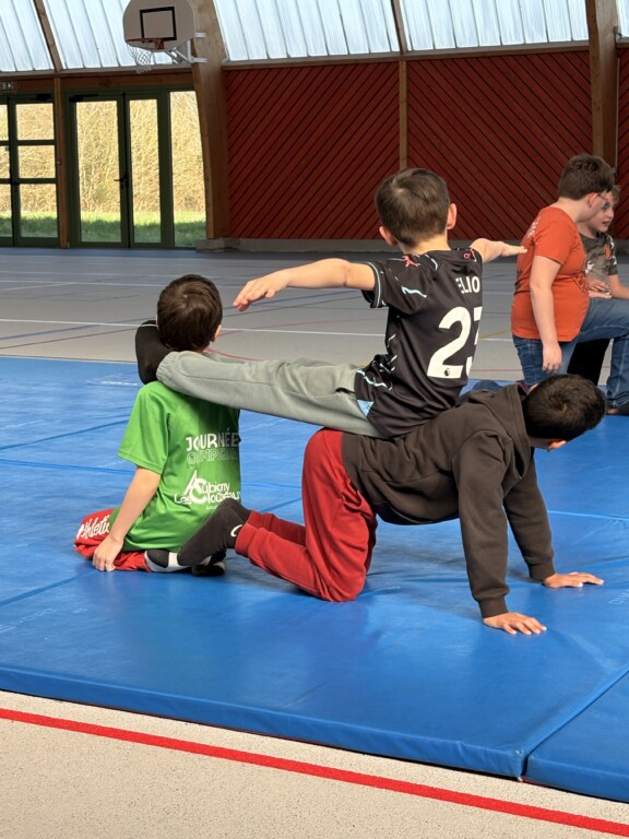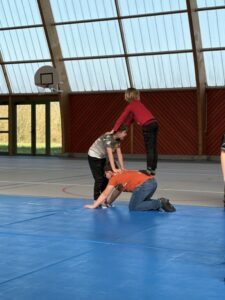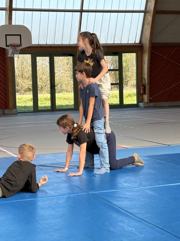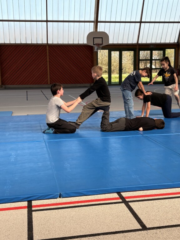 Chaque mardi après-midi, nous nous rendons à la salle de sport pour découvrir et pratiquer cette activité. Les élèves réalisent différentes figures en équipe de 2, 3 ou 4. Ensemble, ils apprennent à construire des enchaînements et à coopérer pour réussir de belles figures.
