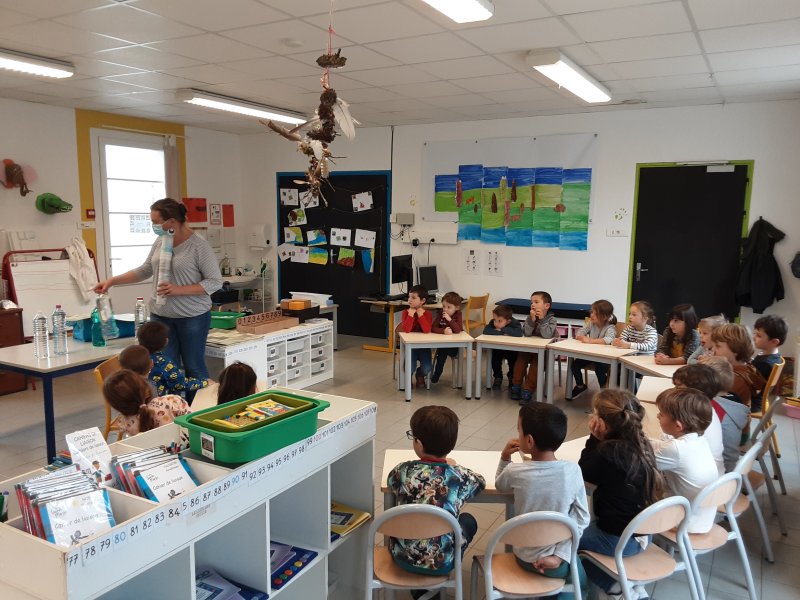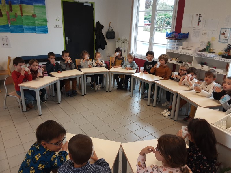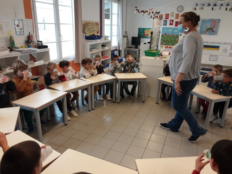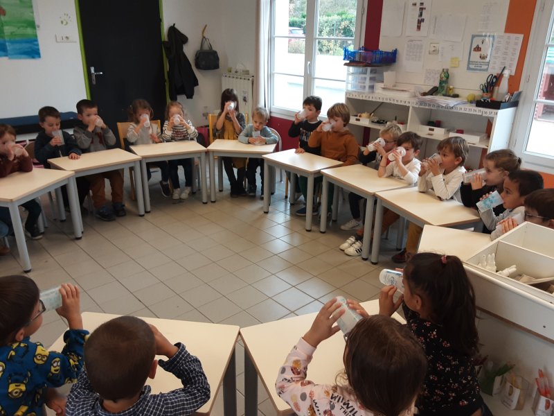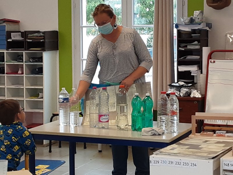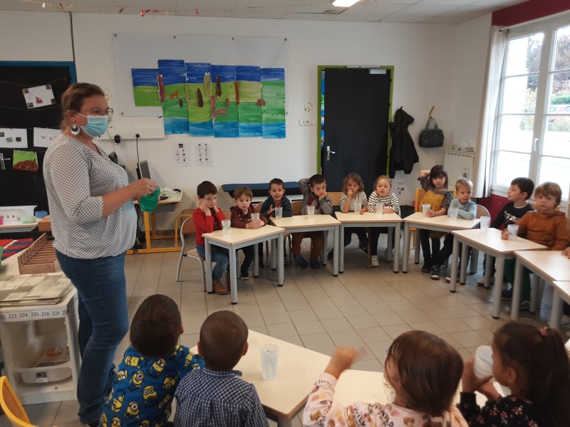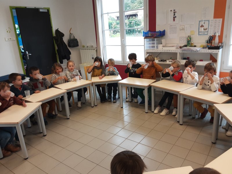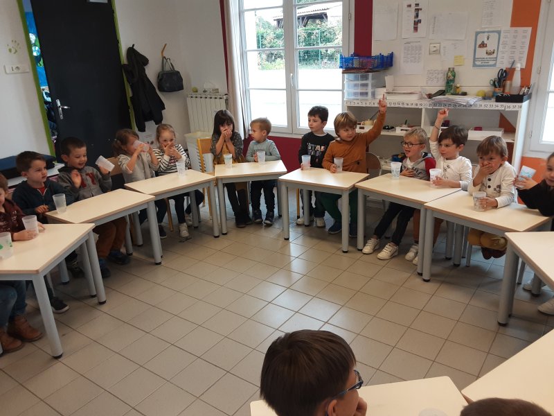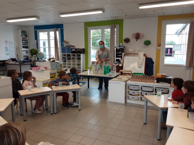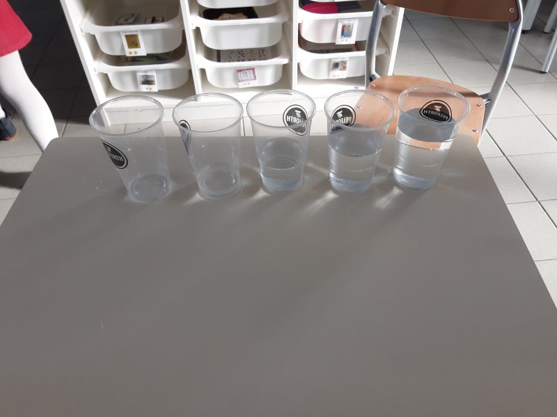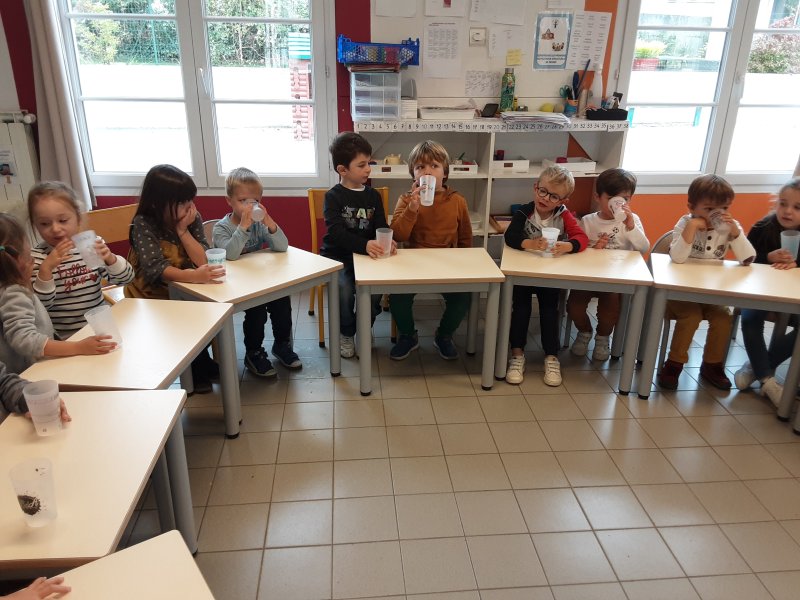 Dans le cadre de la semaine du goût à l’école, les MS-GS ont redécouvert l’EAU en commençant par un petit défi : quelle est l’eau du robinet parmi ces 5 eaux?