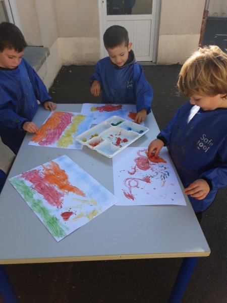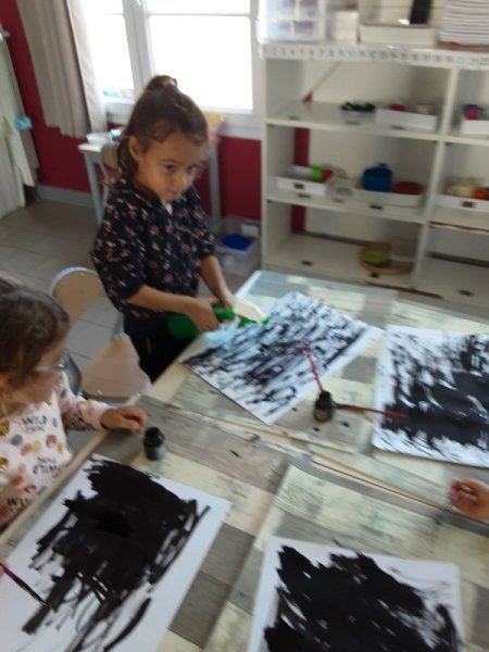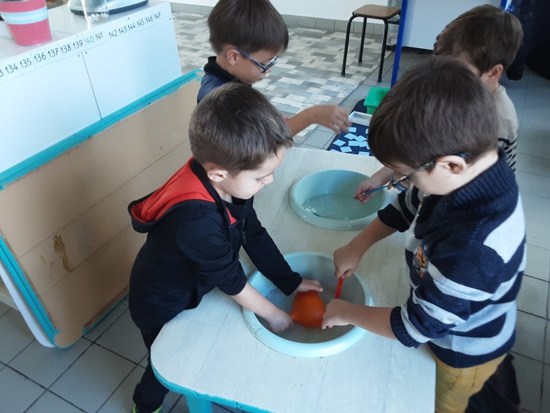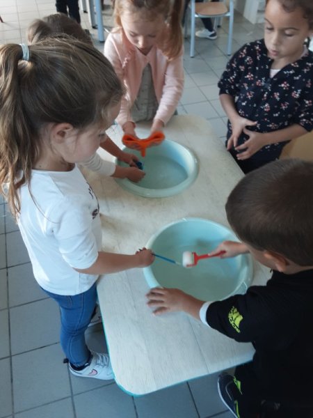 Nous avons également manipulé l’eau dans différents ateliers : peinture avec glaçons, encre et eau, flotte et coule, transvasement, du moins rempli au plus rempli.