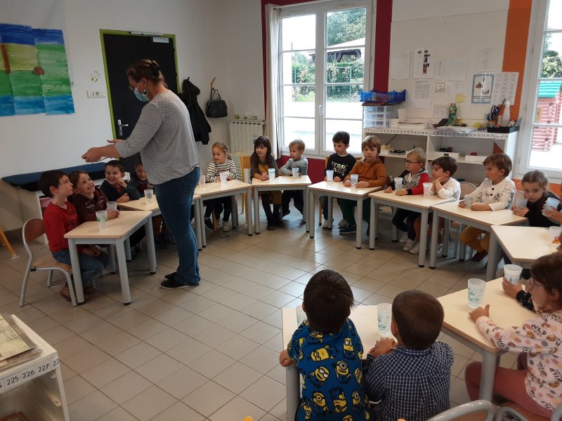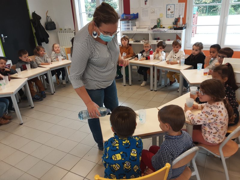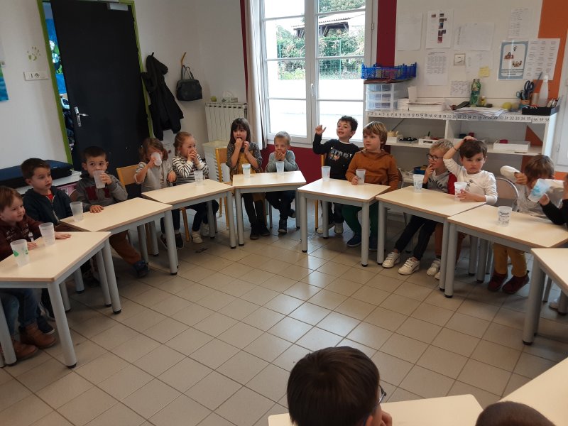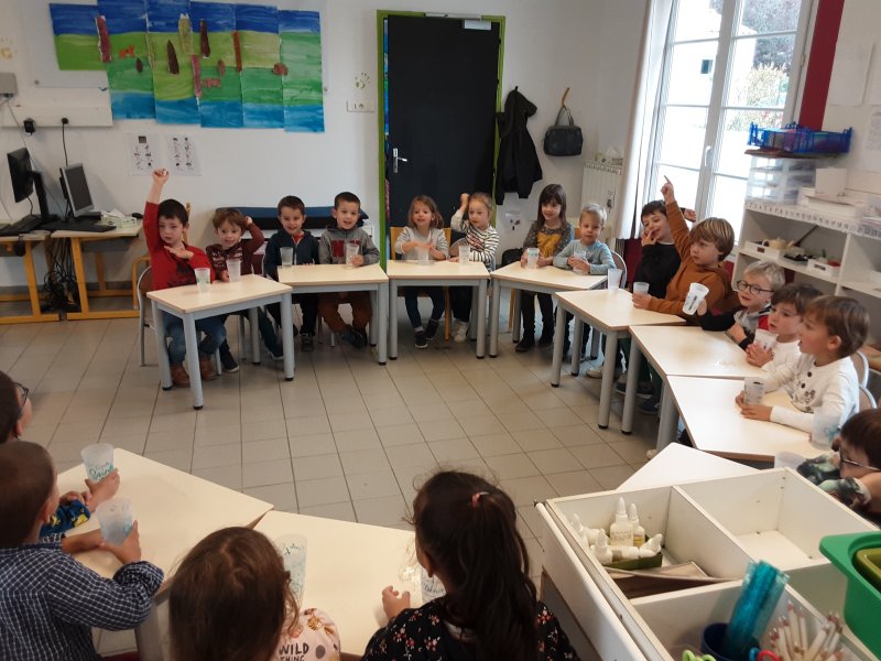 Dans le cadre de la semaine du goût à l’école, les MS-GS ont redécouvert l’EAU en commençant par un petit défi : quelle est l’eau du robinet parmi ces 5 eaux?