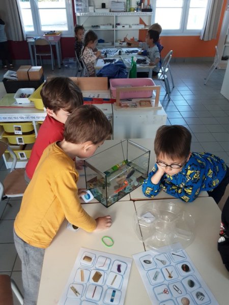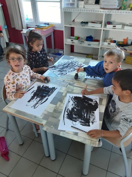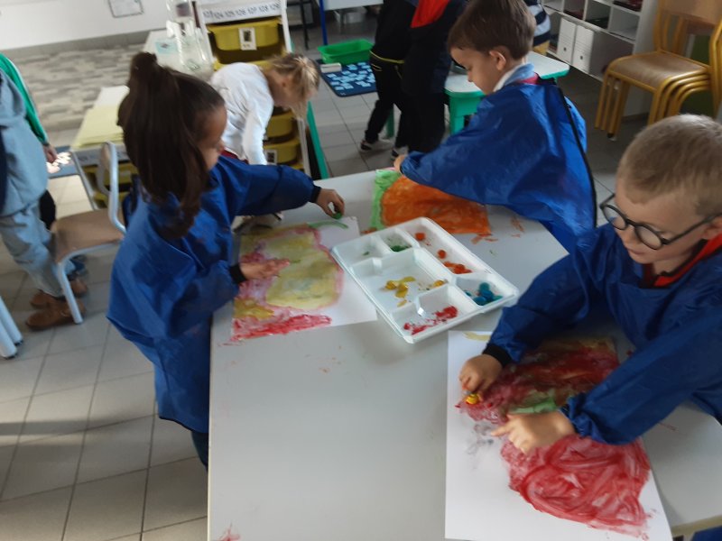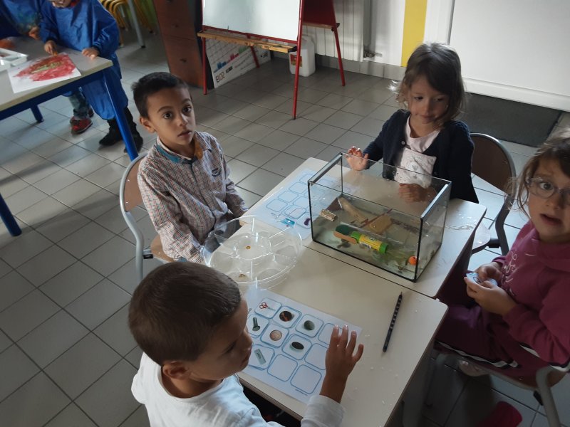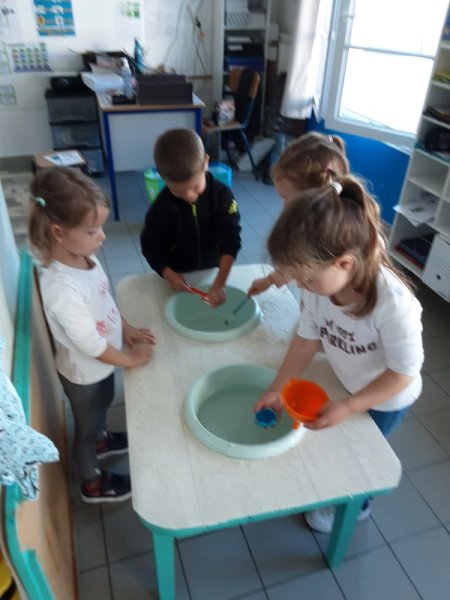 Nous avons également manipulé l’eau dans différents ateliers : peinture avec glaçons, encre et eau, flotte et coule, transvasement, du moins rempli au plus rempli.