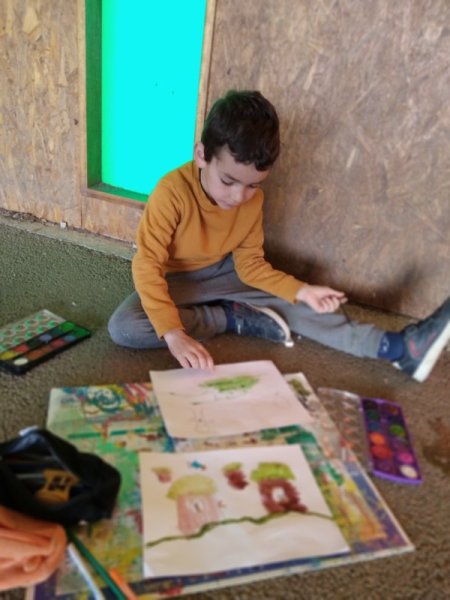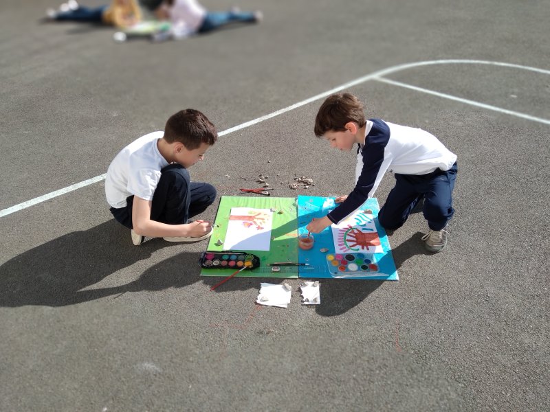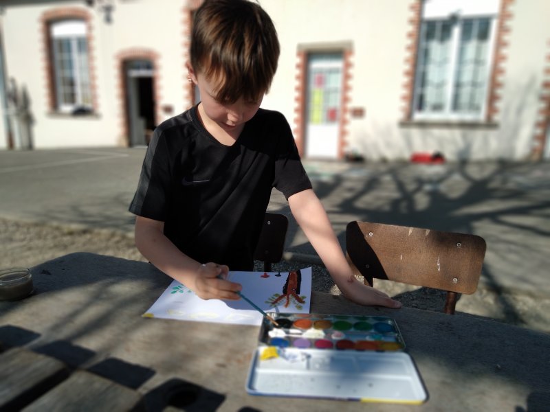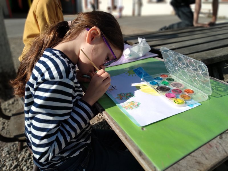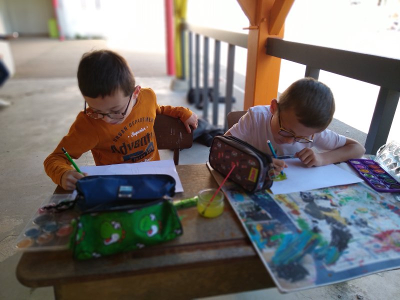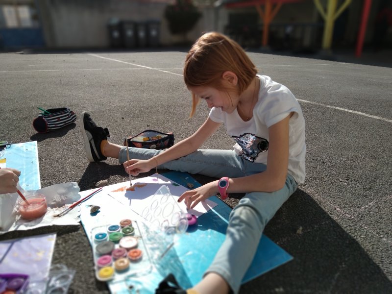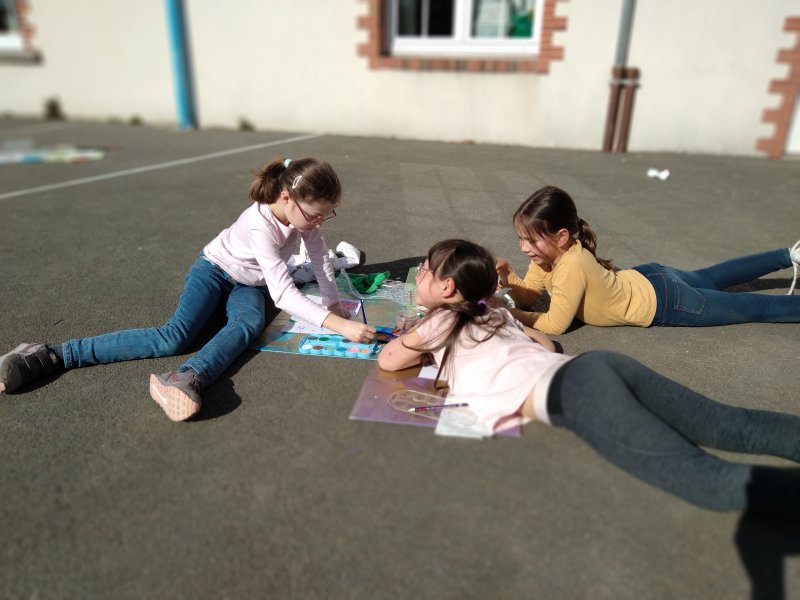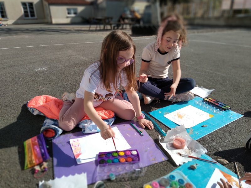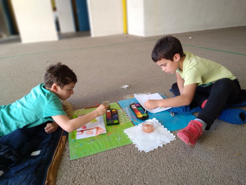 Quel plaisir de faire classe sur la cour quand le soleil refait son apparition! Les élèves de CE1-CE2 ont savouré un moment d’art visuel dehors.