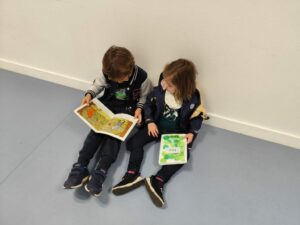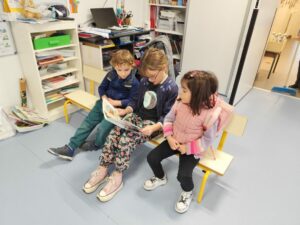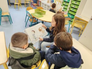Chaque jeudi en fin d’après-midi, un joli moment de partage se crée dans l’école : les élèves de CE1 viennent lire des histoires aux enfants de PS, MS et GS.