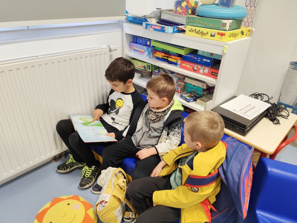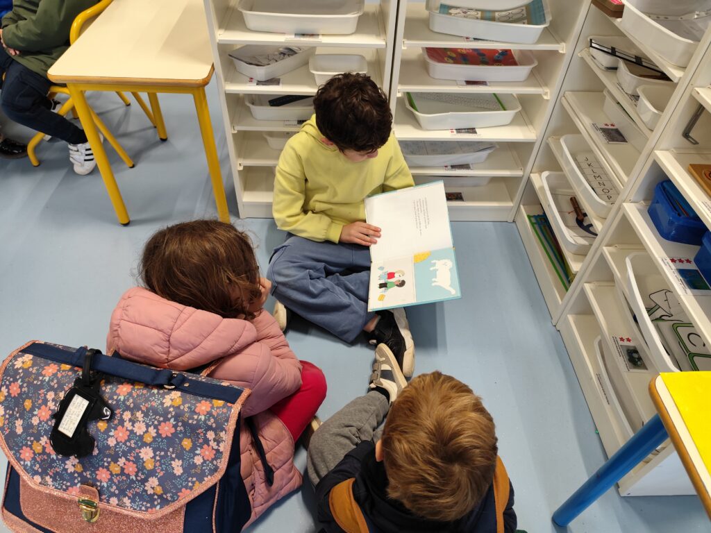 Chaque jeudi en fin d’après-midi, un joli moment de partage se crée dans l’école : les élèves de CE1 viennent lire des histoires aux enfants de PS, MS et GS.