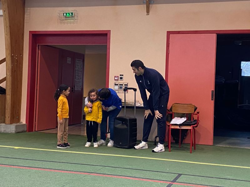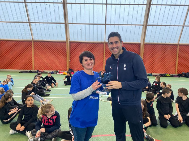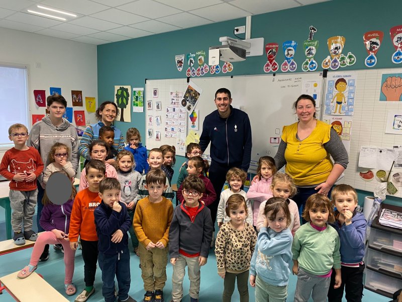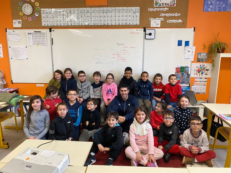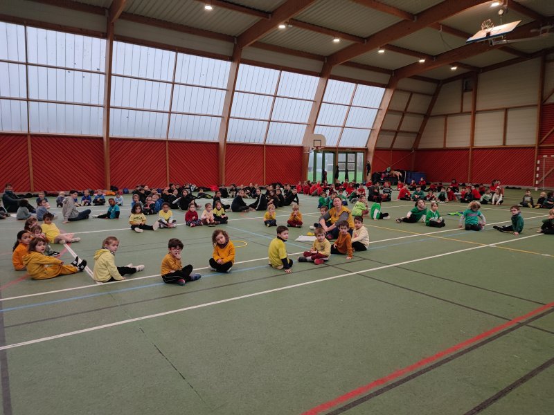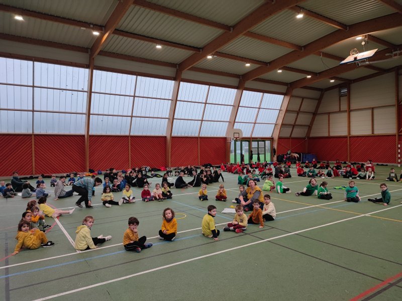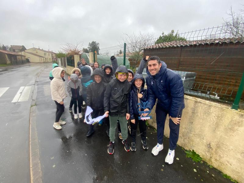 Notre école a participé au relais du Cœur organisé par l’UGSEL Vendée en lien avec les jeux olympiques. Nous avons reçu le cœur ce matin dans notre école. A cette occasion, un grand sportif Jordan Cuelho nous a rejoint. Il nous a apporté le cœur et chaque classe s’est relayée lors d’une course à ses côtés. Bravant la pluie, les enfants ont couru avec plaisir et envie. Notre course s’est terminée à la salle de sport. Les enfants y ont défilé à la manière des délégations de sportifs aux jeux olympiques, puis ils se sont placés pour former les anneaux olympiques. Jordan a ensuite répondu aux questions que les enfants avaient préparées en classe. Pour terminer ce moment festif, les élèves ont réalisé une danse sur la musique des jeux olympiques. De retour à l’école, Jordan Cuelho est passé dans toutes les classes pour signer une dédicace. Nous remercions vivement Jordan pour sa participation à cet évènement sportif ! Nous remercions également les parents qui ont aidé à l’organisation et ceux qui sont venus partager ce moment avec nous !