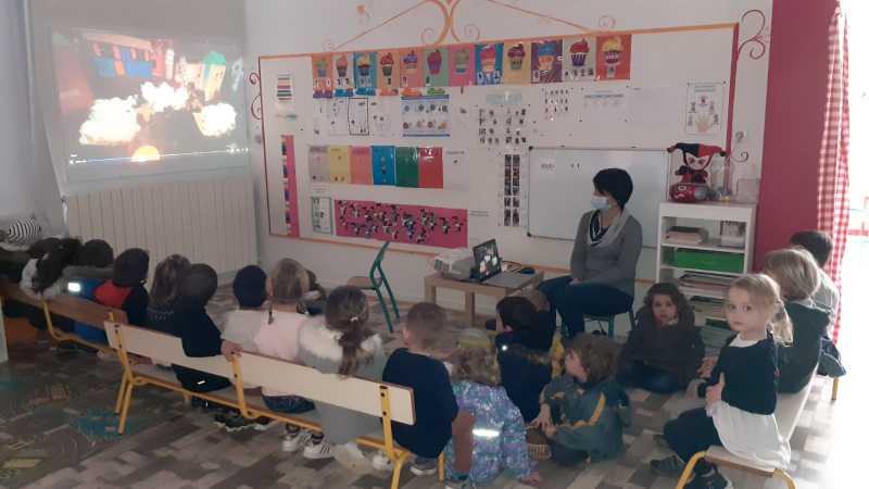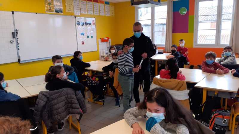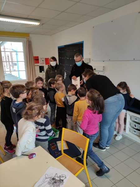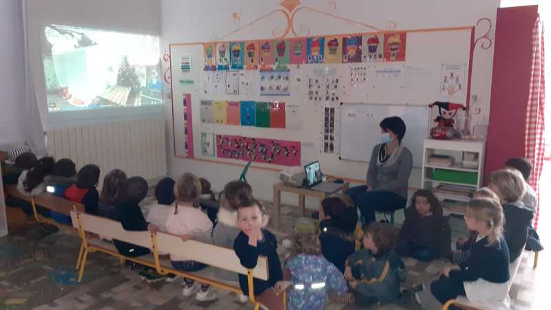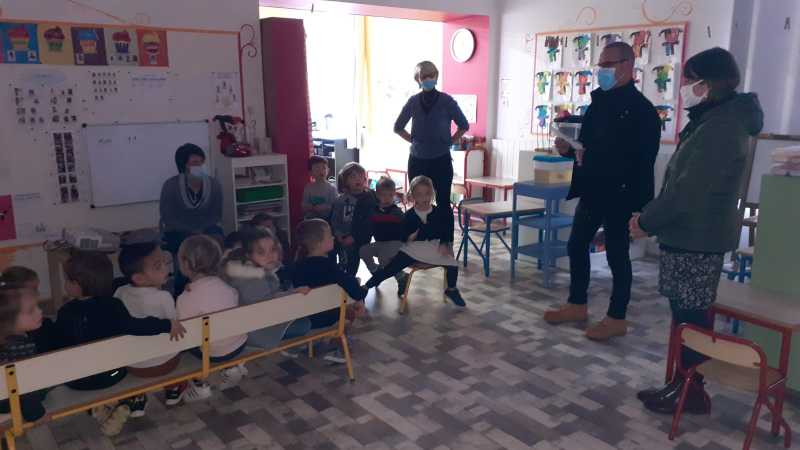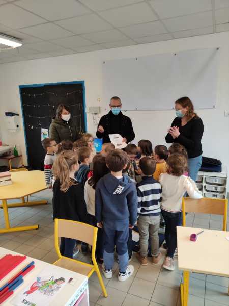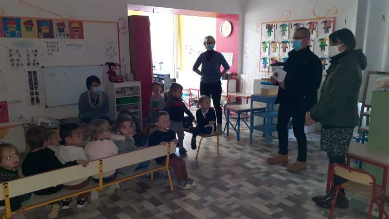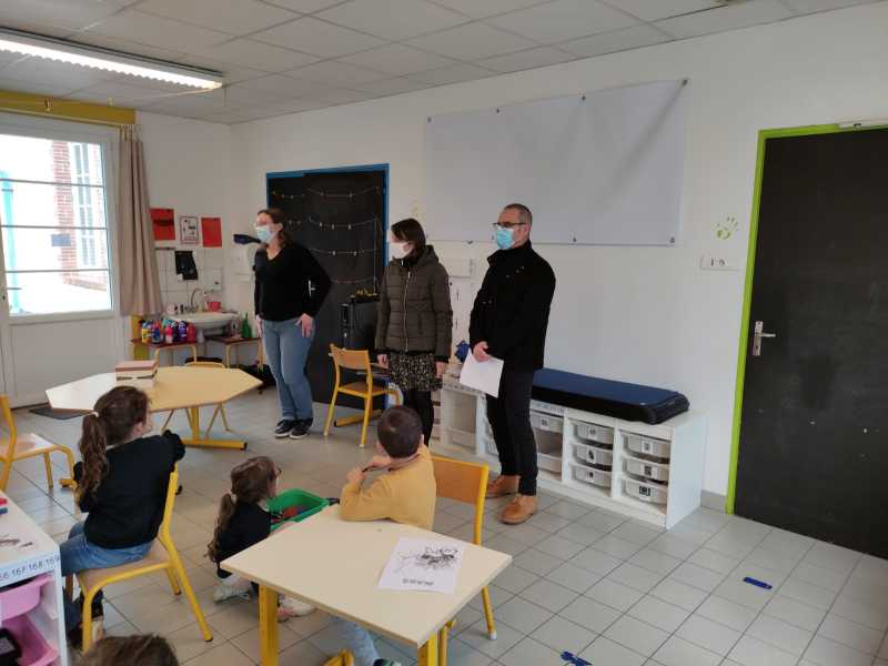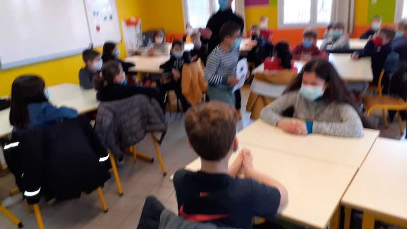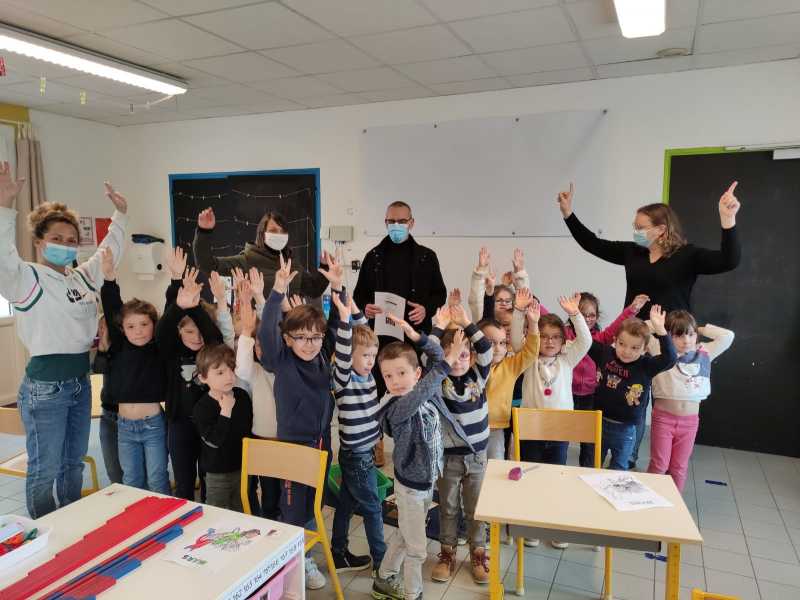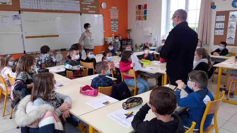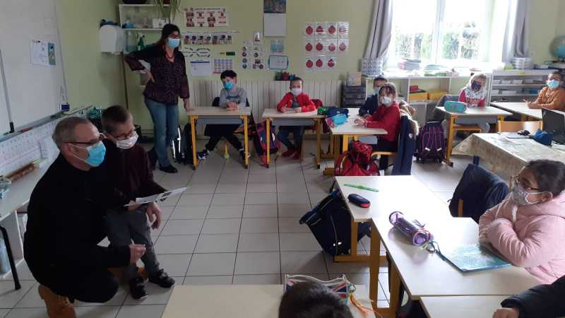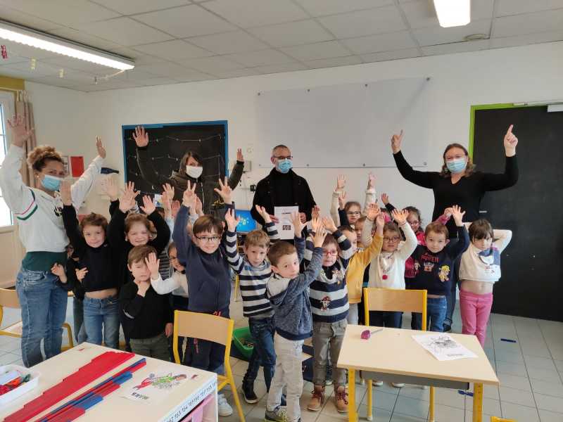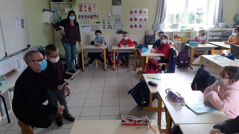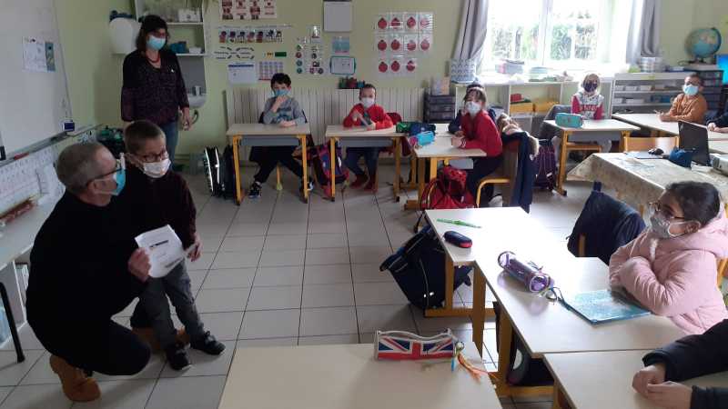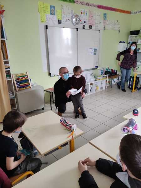 Monsieur CORBILLON est allé visiter chaque classe, accompagné par Marie LEMAITRE, cheffe d’établissement, Hélène LONGIN et Anne-Lise ARTAUD, membres de l’APEL de l’école. La joie des enfants était grande à l’annonce du prix! Les CM ont préparé un discours de remerciement.